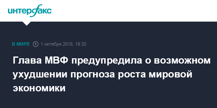 Москва. 1 октября. INTERFAX.RU - Риски в мировой экономике начали материализовываться, заявила глава Международного валютного фонда (МВФ) Кристин Лагард, что может означать вероятность ухудшения прогноза роста мировой экономики, сообщает агентство Bloomberg.