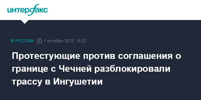 Москва. 1 октября. INTERFAX.RU - В Ингушетии восстановлено движение по участку федеральной трассы "Кавказ", который в понедельник во второй половине дня перекрыли протестующие против соглашения о границах Чечни и Ингушетии, сообщил агентству "Интерфакс" информированный источник.