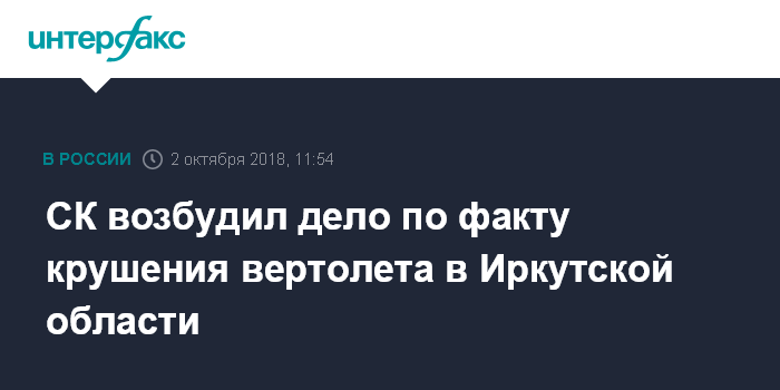 Москва. 2 октября. INTERFAX.RU - В Иркутской области завели уголовное дело по факту гибели двух человек при крушении вертолета Robinson R-44, который в понедельник упал в реку Витим после столкновения с проводами ЛЭП в Бодайбинском районе Иркутской области.