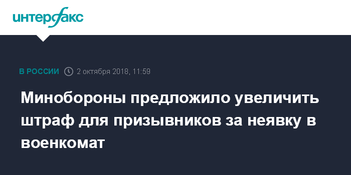Москва. 2 октября. INTERFAX.RU - В Министерстве обороны РФ предлагается увеличить штраф за неявку призывников в военкомат, сообщил начальник 2-го управления Главного организационно-мобилизационного управления Генштаба Вооруженных Сил РФ генерал-майор Виктор Глотов.