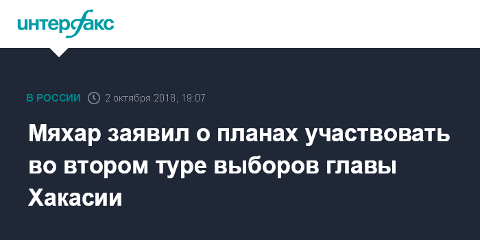 Москва. 2 октября. INTERFAX.RU - Кандидат от "Партии Роста" Александр Мяхар, получивший четвертый результат в ходе первого тура выборов главы Хакасии 9 сентября, планирует принять участие в следующем туре выборов после снятия кандидатом-эсэром Андреем Филягиным своей кандидатуры.