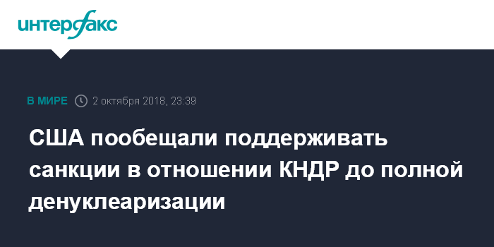 Москва. 2 октября. INTERFAX.RU - США будут продолжать решительно поддерживать санкционный режим в отношении КНДР до полной денуклеаризации, и с такой политикой согласны Китай и Россия, хотя эти страны "могли бы делать больше", заявила во вторник представитель Госдепартамента США Хизер Нойерт.