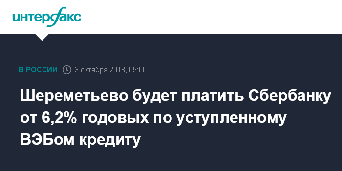 Шереметьево будет платить Сбербанку от 6,2% годовых по уступленному ВЭБом кредиту