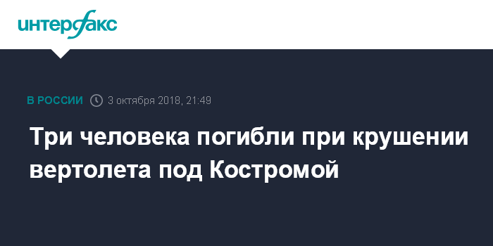 Москва. 3 октября. INTERFAX.RU - Три человека стали жертвами крушения вертолета под Костромой, сообщил "Интерфаксу" источник в оперативном штабе на месте ЧС.