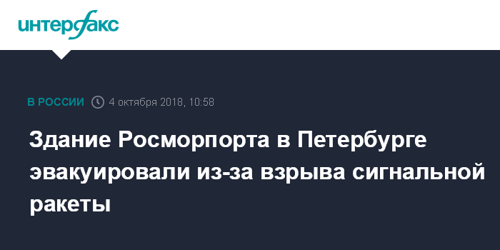 Москва. 4 октября. INTERFAX.RU - Утром в четверг в здании Росморпорта в Петербурге взорвалась сигнальная ракета, один человек пострадал, сообщил "Интерфаксу" информированный источник.