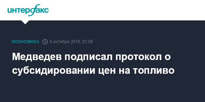 Москва. 5 октября. INTERFAX.RU - Премьер-министр Дмитрий Медведев подписал протокол о частичном субсидировании нефтекомпаниями нефтеперерабатывающих заводов для сдерживания цен на бензин, сообщает в пятницу "Ъ".