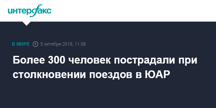 Москва. 5 октября. INTERFAX.RU - При столкновении двух поездов в Йоханнесбурге пострадали более трехсот человек, сообщает в пятницу агентство Associated Press.