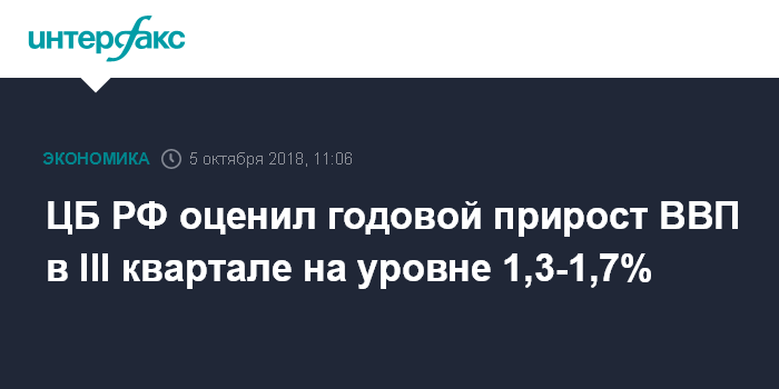 Москва. 5 октября. INTERFAX.RU - ЦБ РФ оценивает годовой прирост ВВП России в третьем квартале 2018 года на уровне 1,3-1,7%, сохраняет прогноз роста экономики в 2018 году в 1,5-2,0%. Об этом говорится в комментарии Банка России по экономике.