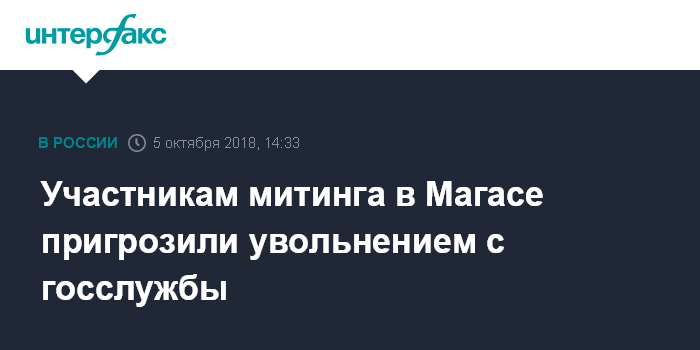 "Сегодня несколько ребят пришли на работу в 9 утра без опоздания, приняв участие в митинге в Магасе. Глава ведомства провел с ними разъяснительную беседу о недопустимости участия в подобных акциях, несмотря на то, что госслужащие присутствовали на площади после рабочего дня. Руководитель пригрозил подчиненным наказанием за такое поведение вплоть до увольнения", - сказал собеседник агентства.