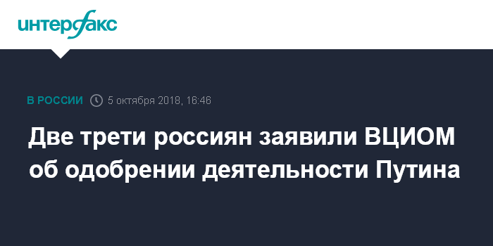 Москва. 5 октября. INTERFAX.RU - Деятельность президента РФ Владимира Путина одобряют около двух третей россиян, данный показатель стабилен на протяжении последних трех месяцев, свидетельствуют данные опроса ВЦИОМ, поступившие в пятницу в "Интерфакс".