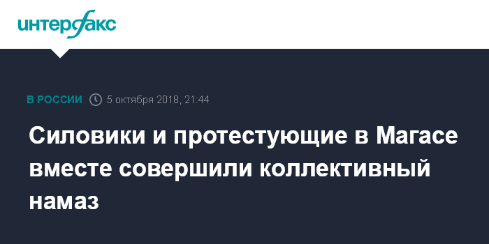 Москва. 5 октября. INTERFAX.RU - Протестующие и полицейские в центре Магаса вместе совершили коллективную пятничную молитву, сообщил агентству "Интерфакс" представитель духовенства республики.