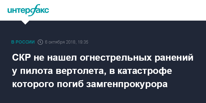 Москва. 6 октября. INTERFAX.RU - Следственный комитет РФ опроверг информацию СМИ о том, что пилот вертолета, в котором в Костромской области разбился замгенпрокурора РФ Саак Карапетян, был застрелен.
