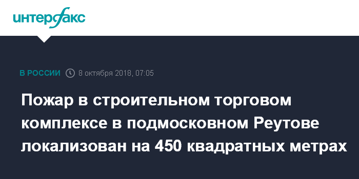 Москва. 8 октября. INTERFAX.RU - Пожарным удалось локализовать возгорание в строительном торговом комплексе "Владимирский тракт", расположенном в подмосковном Реутове близ Московской кольцевой автодороги, сообщает ГУ МЧС России по Московской области.