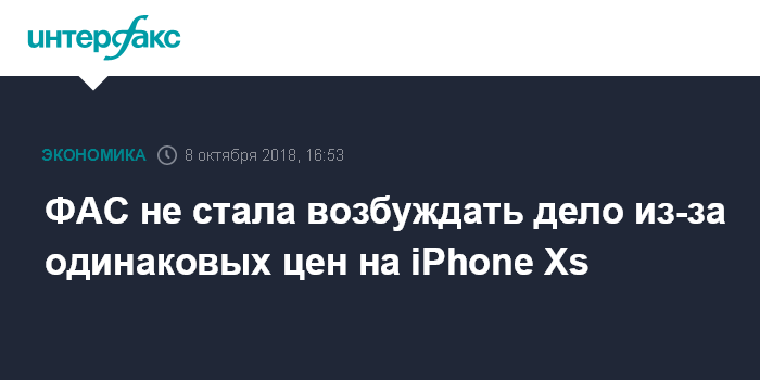 Москва. 8 октября. INTERFAX.RU - Федеральная антимонопольная служба (ФАС) РФ отказалась возбуждать дело по жалобе на возможный сговор при установлении цен на телефоны Apple iPhone Xs и Xs Max в рознице, однако продолжит анализ ситуации.