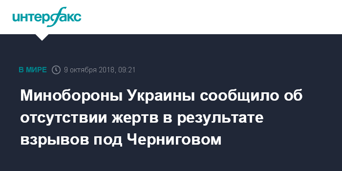 Москва. 9 октября. INTERFAX.RU - Пострадавших среди военнослужащих и гражданского населения в результате взрывов на шестом арсенале боеприпасов в Черниговской области нет, сообщили в министерстве обороны Украины.