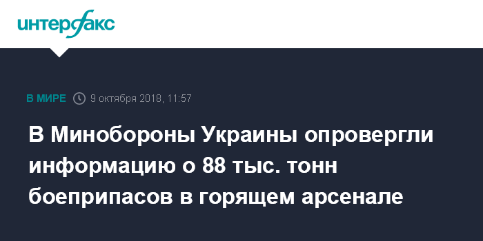 Москва. 9 октября. INTERFAX.RU - В Минобороны Украины опровергают опубликованную ранее на сайте Государственной службы по чрезвычайным ситуациям (ГСЧС) информацию о том, что в горящих в Черниговской области военных складах находится около 88 тысяч тонн боеприпасов.
