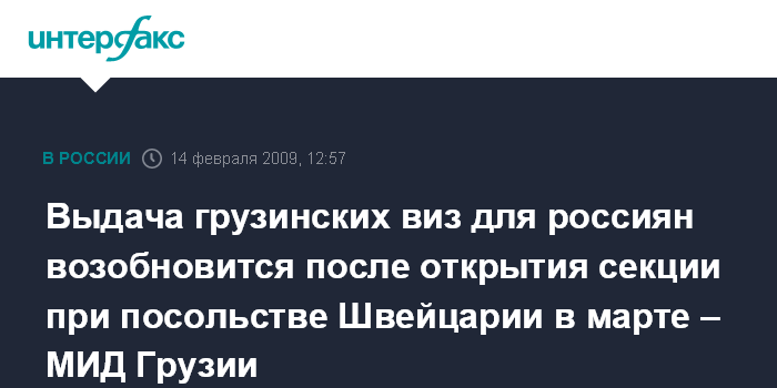Тбилиси. 14 февраля. INTERFAX.RU - Секции Грузии и РФ при посольствах Швейцарии в Тбилиси и Москве откроются одновременно в марте, заявил журналистам в субботу министр иностранных дел Грузии Григол Вашадзе.