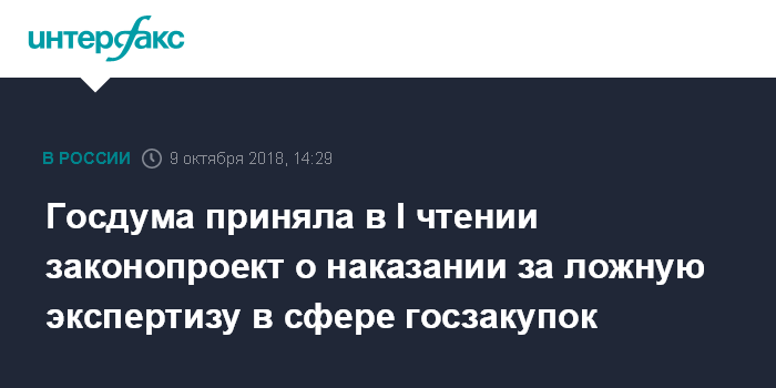 Москва. 9 октября. INTERFAX.RU - Госдума РФ приняла в первом чтении законопроект об ответственности за предоставление заведомо ложного экспертного заключения в сфере госзакупок; нарушителям будет грозить до четырех лет тюрьмы и до 500 тыс. рублей штрафа.
