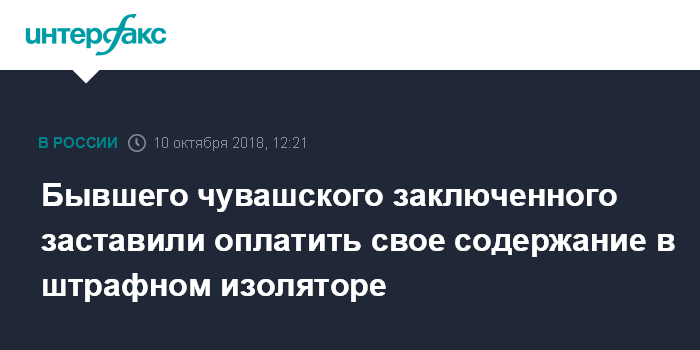Москва. 10 октября. INTERFAX.RU - Спецпрокуратура Чебоксар через суд взыскала с бывшего заключенного 5 тысяч рублей, которые исправительная колония потратила на его содержание.