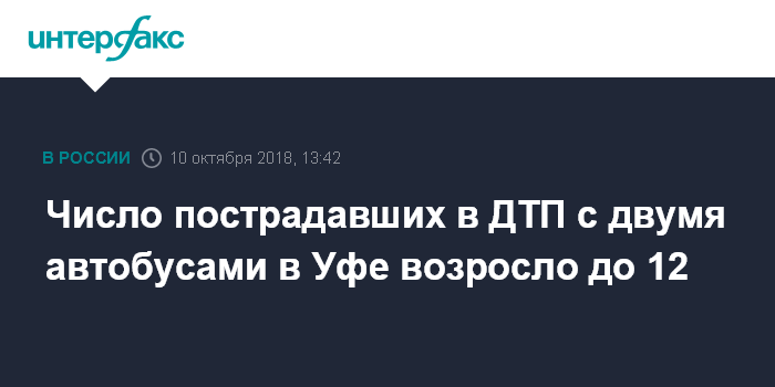 Москва. 10 октября. INTERFAX.RU - Двенадцать человек получили травмы в результате ДТП с участием двух пассажирских автобусов в Уфе, сообщили агентству "Интерфакс" в пресс-службе ГУ МЧС по Башкирии в среду.