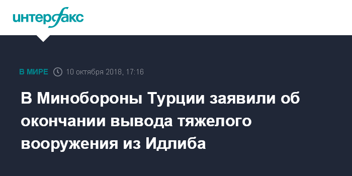 Москва. 10 октября. INTERFAX.RU - Минобороны Турции в среду сообщило, что все тяжелое вооружение выведено из демилитаризованной зоны в сирийской провинции Идлиб, сообщает Анатолийское агентство новостей.