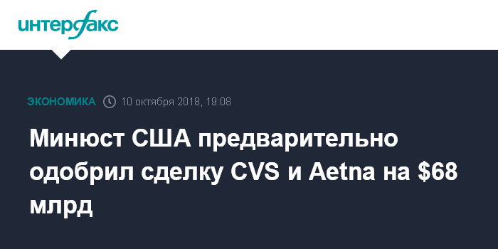 Москва. 10 октября. INTERFAX.RU - Министерство юстиции США в среду предварительно одобрило сделку аптечной сети CVS Health Corp. и страховщика Aetna Inc. на $68 млрд, которая изменит порядок доступа потребителей к медицинским услугам и лекарственным препаратам.