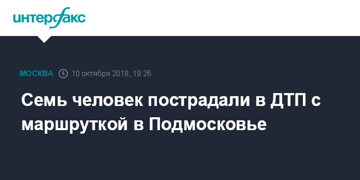 Москва. 10 октября. INTERFAX.RU - Семь человек пострадали в автомобильной аварии с участием маршрутки в подмосковном Солнечногорске, один из них госпитализирован, сообщили "Интерфаксу" в пресс-службе министерства здравоохранения Московской области.