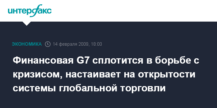 Кризис невозможно преодолеть без открытой системы мировой торговли и инвестиций, считают страны-участницы G7. "G7 остается привержена идеям неприятия протекционистских мер, которые только усугубят падение экономического роста, а также установления новых барьеров, и заявляет о необходимости скорейшего завершения Дохийского раунда переговоров ВТО", - говорится в коммюнике.