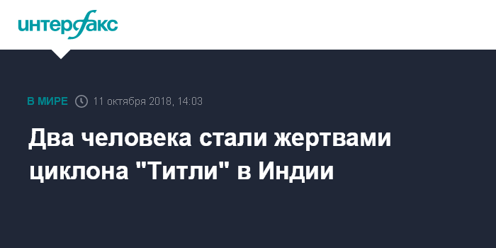 Москва. 11 октября. INTERFAX.RU - По меньшей мере два человека стали жертвами циклона "Титли", обрушившегося в четверг на восточную часть Индии, передает индийский телеканал NDTV.
