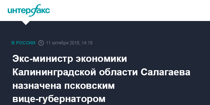 Москва. 11 октября. INTERFAX.RU - Бывший министр экономики Калининградской области Нинель Салагаева назначена заместителем губернатора Псковской области, курирующим вопросы экономики и инвестиций, сообщает пресс-служба администрации региона.