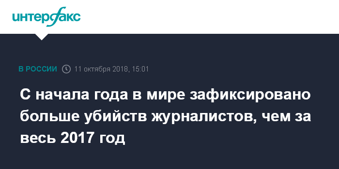 Москва. 11 октября. INTERFAX.RU - В мире за девять месяцев 2018 года 56 журналистов были убиты из-за профессиональной деятельности, сообщили в четверг в международной организации "Репортеры без границ".
