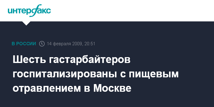 Москва. 14 февраля. ИНТЕРФАКС-МОСКВА - С подозрением на пищевую инфекцию в Москве госпитализированы шесть строителей, сообщил "Интерфаксу" в субботу источник в медицинских кругах столицы.