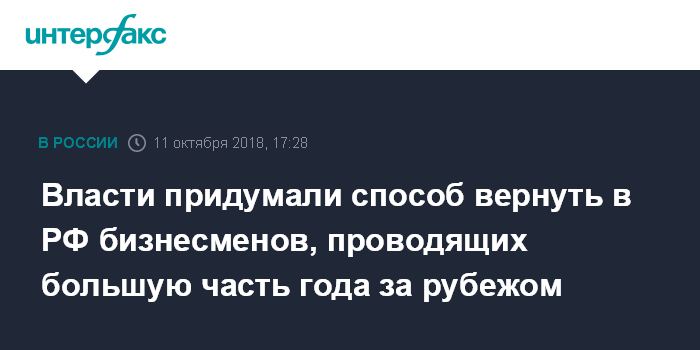 Москва. 11 октября. INTERFAX.RU - Чиновники хотят вернуть в Россию крупных предпринимателей, которые после принятия законодательства о контролируемых иностранных компаниях предпочли отказаться от статуса налоговых резидентов РФ и проводить большую часть года за рубежом.