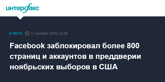 Москва. 11 октября. INTERFAX.RU - Сотрудники социальной сети Facebook заблокировали свыше 800 страниц и аккаунтов пользователей за распространение ложной информации в преддверии запланированных на ноябрь промежуточных выборов в США, сообщает в четверг американский телеканал CNN.