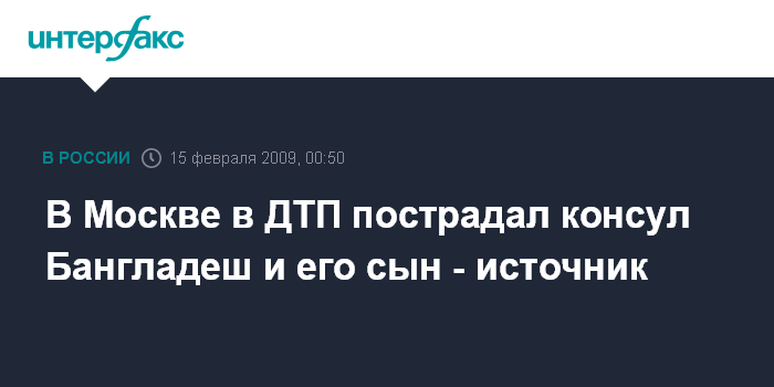 Москва. 15 февраля. ИНТЕРФАКС-МОСКВА - В Москве в автомобильную аварию попал консул Бангладеш 52-летний господин Ислам Джахиру Мухамед и его 16-летний сын Ислам Мухамед Пранион.