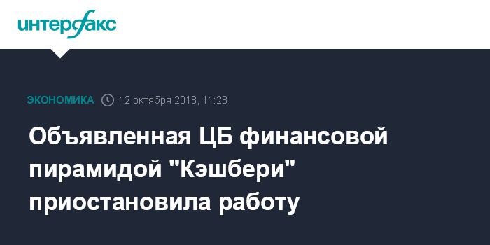 26 сентября ЦБ РФ объявил о выявленных явных признаках финансовой пирамиды в деятельности группы российских и иностранных компаний под единым брендом "Кэшбери", передал информацию о них в Генеральную прокуратуру РФ и МВД.