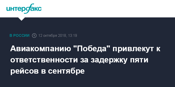 Москва. 12 октября. INTERFAX.RU - Московская межрегиональная транспортная прокуратура (ММТП) инициировала возбуждение административных дел в связи задержками пяти рейсов авиакомпании "Победа".