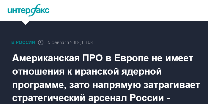 "Что касается противоракетной обороны, то мы уже неоднократно говорили публично, объясняли на профессиональном экспертном уровне, в том числе и по прямым каналам в контактах с нашими американскими партнерами, что она, по нашей экспертной профессиональной оценке, по нашему глубочайшему убеждению, не имеет отношения к иранской ядерной программе, она имеет отношение к стратегической стабильности, к стратегическом паритету и она затрагивает напрямую стратегический арсенал Российской Федерации", - сказал глава МИД РФ в субботу вечером в эфире телеканала ТВЦ.