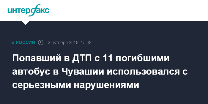 Москва. 12 октября. INTERFAX.RU - Автобус, 11 пассажиров которого погибли при столкновении с грузовиком в Чувашии, не прошел предрейсовый осмотр, на маршрут не была выписана путевка, а водителя не проверяли медики, сообщила официальный представитель Следственного комитета (СК) Светлана Петренко.