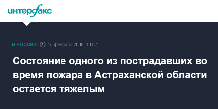 Астрахань. 15 февраля. INTERFAX.RU - Из семи пострадавших во время пожара в трехэтажном жилом доме в поселке Молодежный (Астраханская область) состояние одного остается тяжелым, сообщил агентству "Интерфакс-Юг" в воскресенье министр здравоохранения Астраханской области Виктор Акишкин.