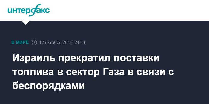 Москва. 12 октября. INTERFAX.RU - Министр обороны Израиля Авигор Либерман принял решение о прекращении поставок топлива в сектор Газа в связи с новой волной беспорядков на границе этого региона, сообщает газета JPost.