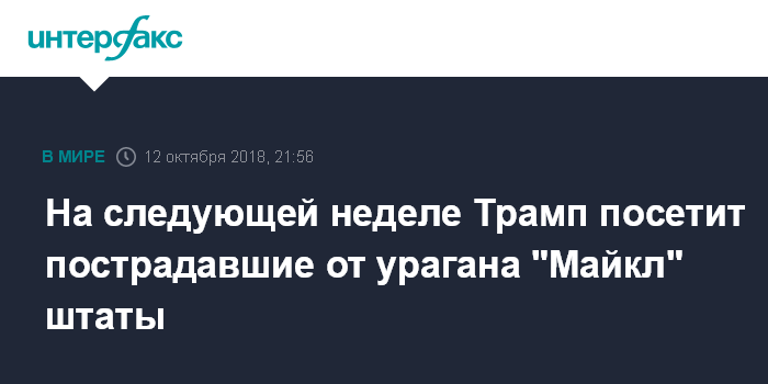Москва. 12 октября. INTERFAX.RU - Президент США Дональд Трамп планирует в начале следующей недели посетить штаты Джорджия и Флорида, которые серьезно пострадали от урагана "Майкл".