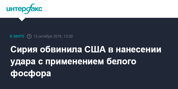 Москва. 13 октября. INTERFAX.RU - Международная коалиция во главе с США в ходе операций в Сирии нанесла авиаудары с применением запрещенного вещества - белого фосфора, сообщает в субботу сирийское агентство САНА.