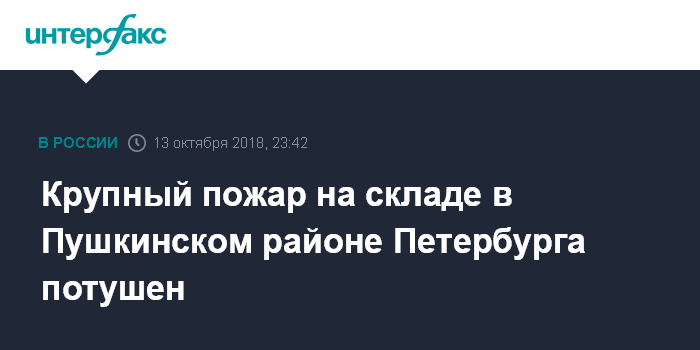 Москва. 13 октября. INTERFAX.RU - Пожарные ликвидировали возгорание на складе в Пушкинском районе Петербурга, сообщает городской главк МЧС.