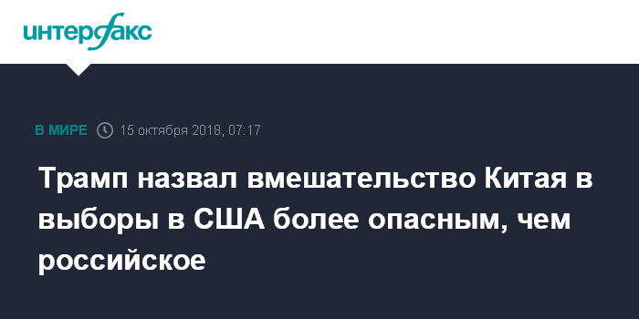 Москва. 15 октября. INTERFAX.RU - Президент США Дональд Трамп заявил, что Россия и Китай действительно пытались повлиять на американские выборы в 2016 году, однако именно китайское вмешательство беспокоит его больше всего.