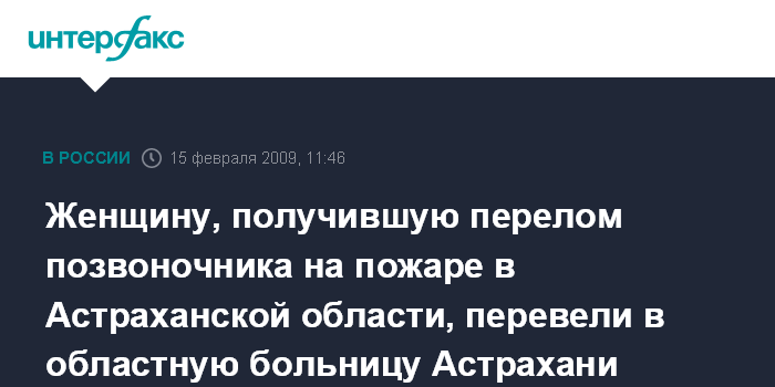 Астрахань. 15 февраля. INTERFAX.RU - Женщина, получившая тяжелые травмы во время пожара в поселке Молодежный, доставлена в Астрахань и помещена в областную клиническую больницу.