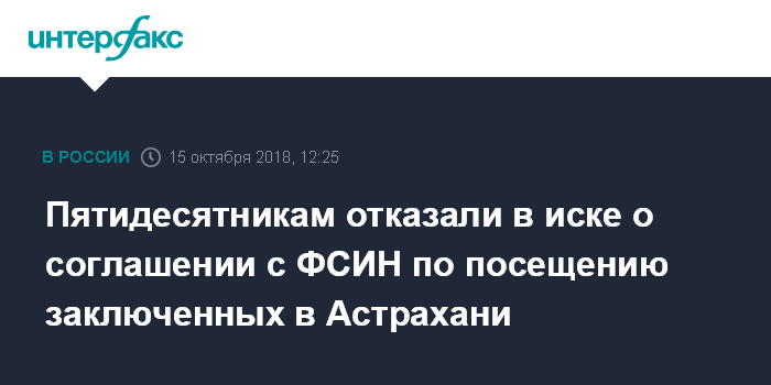 Москва. 15 октября. INTERFAX.RU - Замоскворецкий суд Москвы отказал Централизованной религиозной организации Ассамблеи Бога (пятидесятникам) в заключении соглашения с ФСИН РФ о посещении заключенных в Астрахани и Астраханской области, передает корреспондент "Интерфакса" из зала суда.