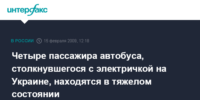 Киев. 15 февраля. INTERFAX.RU - Четыре из четырнадцати пострадавших пассажиров автобуса, который накануне столкнулся с электричкой в Тернопольской области, находятся в тяжелом состоянии.