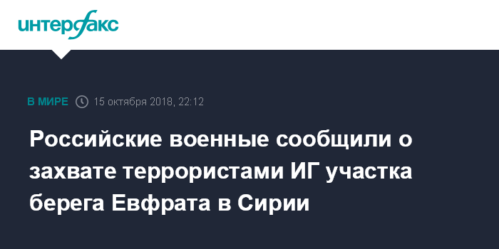 Москва. 15 октября. INTERFAX.RU - Российские военные сообщают о вылазке боевиков ИГ (запрещенная в РФ террористическая организация) на юге сирийской провинции Дейр-эз-Зор, где за контроль над ситуацией отвечают США и подконтрольные им формирования.
