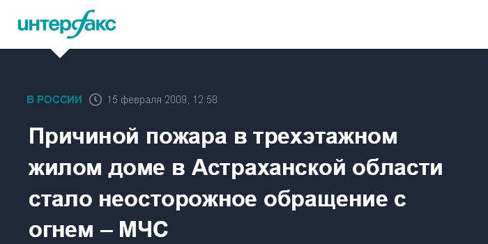 Астрахань. 15 февраля. INTERFAX.RU - Установлена, по предварительным данным, причина пожара в трехэтажном жилом доме в Астраханской области.